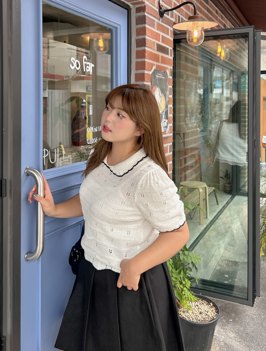 以下是夏季限時優惠款式! 13.5~18.5限時6日🔥 ♡洞洞配色邊有領針織衫♡ 3 SIZE 2 COLORS *黑色只剩1碼了* -顏色- 白色/ 黑色 Model 穿著 | 1碼 | ❤️優惠價HKD249❤️ (原價HKD399) 詳細尺碼: 1碼 肩闊37 胸圍100~(有彈性) 袖長22 總長度52 2碼 肩闊39 胸圍110~(有彈性) 袖長23 總長度55 3碼 肩闊41 胸圍120~(有彈性) 袖長24 總長度58 (以cm為單位)